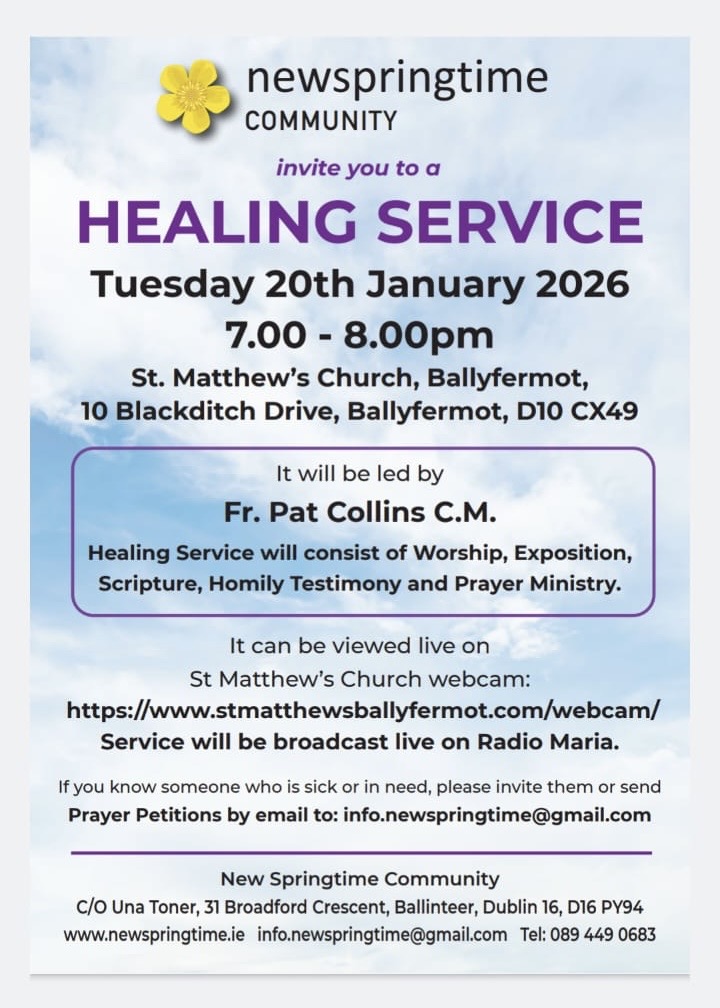 Healing Service Tuesday 20th January 2026 7.00-8.00pm 6th January 2026 Parish Secretary Parish News 0 Comments